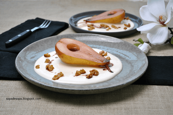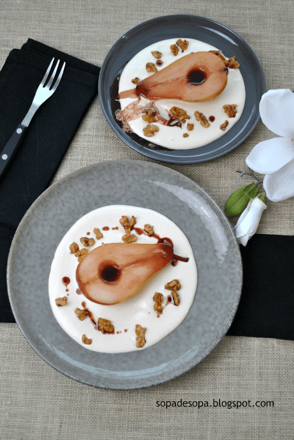 Peras en Sous Vide en Marsala, crema de mascarpone y nueces