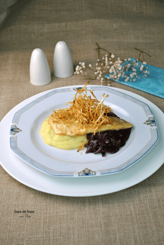 Servir; Colocar en el fondo del plato una porción de puré y de cebolla, colocar el lomo de perca encima y cubrirlo con el el apionabo en juliana.