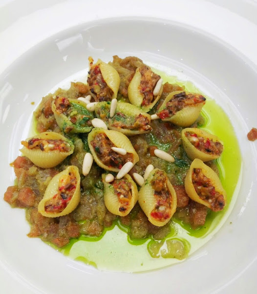 Mientras tanto calentar ½ ct de aceite y sofreír la cebolla picada, añadir los tomates en dados y cocinar 2 ? 3 min. Agregar la salsa pesto y 2 Cd de agua, mezclar bien y salpimentar. En otra sartén, dorar los pimientos, las aceitunas y los champiñones en el aceite restante, hasta que los champiñones estén blandos. Incorporar el requesón. Rellenar las conchas con la mezcla de requesón, servir con la salsa de tomate y decorar con los piñones y la albahaca.