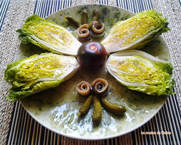 Cortamos los cogollos por la mitad y los lavamos con cuidado. Pelamos los tomates y colocamos en un plato los cogollos y los tomates como se indica en la foto. Salpimentamos y regamos todo con una vinagreta preparada con el aceite y el vinagre, la sal y la pimienta, todo ello muy bien mezclado.