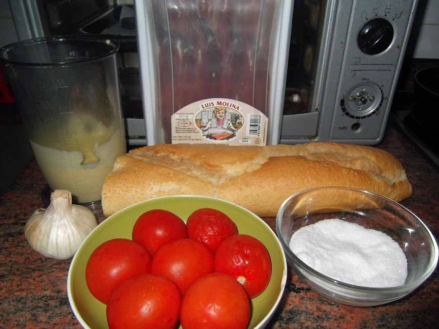 Lo primero que hacemos son las rebanadas de pan las tostamos un poco. Exprimimos los tomates naturales, les añadimos un poco de aceite de oliva. Una vez que está el pan tostado le restregamos un poco de ajo y le echamos encima el tomate y luego ponemos la anchoa.