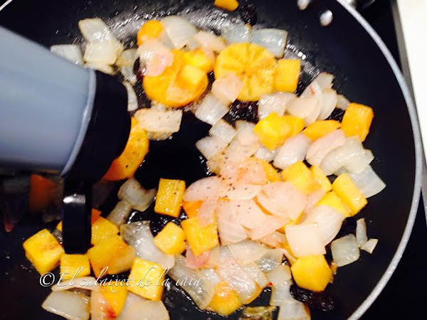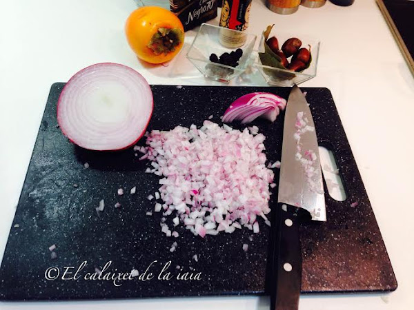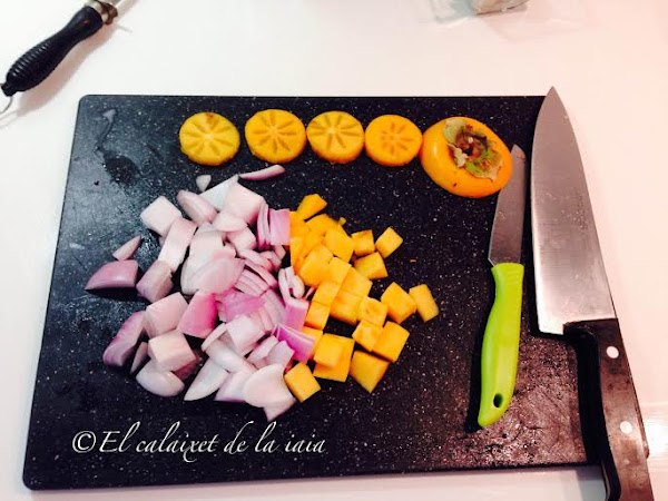 Troceamos en dados la otra media cebolla.Preparamos la guarnición de caqui, pelándolo y troceándolo en dados. Por si no conocéis el caqui, a mi parecer es una mezcla entre mango, melocotón y albaricoque que merece la pena comer ya que tan solo una pieza, aporta la ingesta adecuada diaria de calcio, hierro y magnesio, y altos niveles de potasio y cobre.