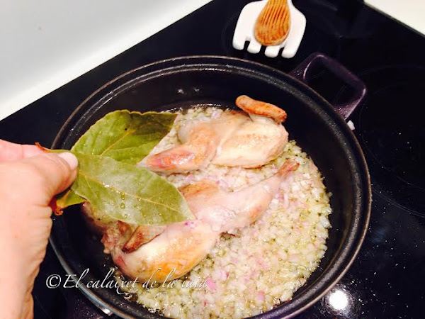 Cuando tengamos la perdiz dorada, añadimos la cebolla picada junto a la hojita de laurel y dejamos pochar