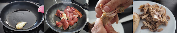 Una sartén al fuego con una cucharada de aceite y calentar con un ajo machacado. Añadir y freír los higaditos de pollo. Mientras deshuesar el resto de la perdiz y reservar la carne.