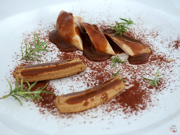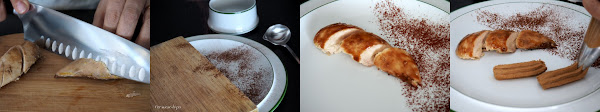 Decorar con un poco de cacao en polvo. Cortar cada pechuga en tres porciones y colocarlas en el plato junto a un par de churros de paté. Bañar la carne con la salsa de jugo de perdiz y chocolate.
