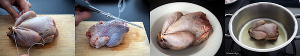 Limpiar bien la perdiz, que no queden restos de plumas. Bridarla con ayuda de un hilo de cocina, de manera que alas y muslos queden pegados al cuerpo. Salpimentarla.