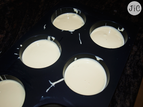 - Vertemos una pequeña parte de chocolate en cada uno de los huecos. No os paséis, no hace falta que sea mucho.