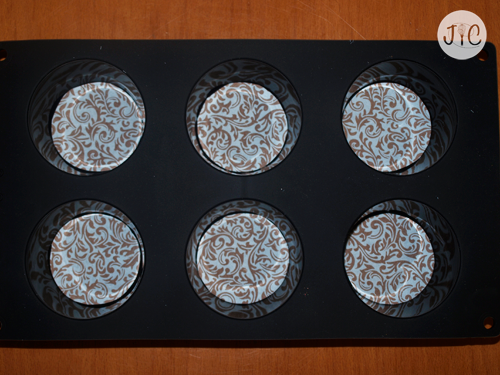 - Lo primero que hay que hacer es recortar círculos de la hoja de transfer del tamaño del fondo de la bandeja en la que vayamos a hacer estas galletas. Yo he utilizado una bandeja de muffins de silicona. El chocolate se despega perfectamente de la silicona.