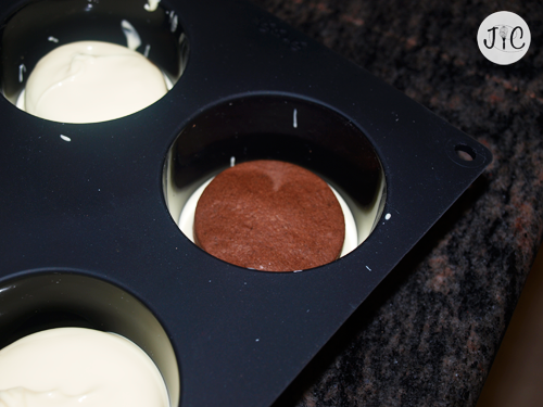 - Colocamos una galleta en cada hueco y presionamos levemente para que se quede pegada. Si no presionamos puede que cuando echemos el chocolate más tarde la galleta se mueva.
