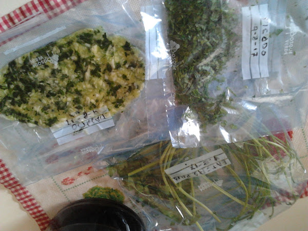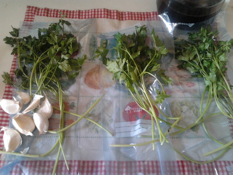 El primero le quito los tallos y pongo en el mortero todas las hojas y varios dientes de ajo pelados. Los machaco bien, hasta que quede una pasta y ya tengo para echar a los guisos o hacer algún plato de salsa verde. Lo meto en una bolsa de congelar, lo aplasto y extiendo bien y le pongo la fecha.