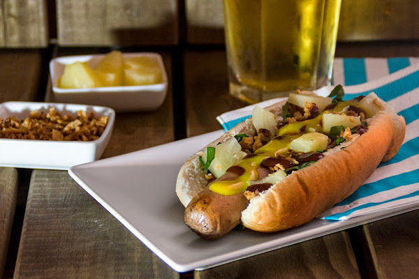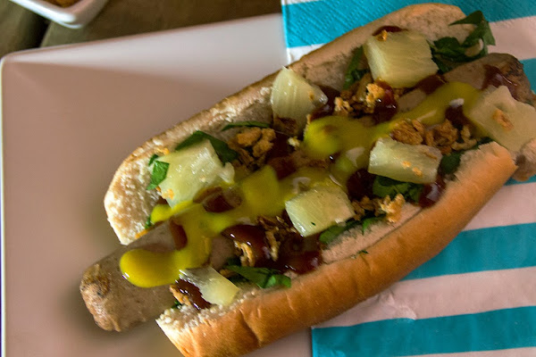 En el panecillo tan tostado, ponemos una cama de lechuga, colocamos la salchicha bien caliente encima y terminamos con la cebolla frita, las rodajas de piña en trozos y salseamos con el ketchup de curry y la mostaza de piña.