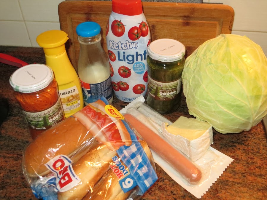 Cortamos en trocitos pequeños la col y rallamos la zanahoria, también la podéis comprar de bote y ya la tenéis rallada, además a mí me gusta más que cruda. Le añadimos la mostaza, el kétchup y la mayonesa. Cortamos en rebanadas grandes y un poco gordas los pepinillos grandes y el queso cremoso.