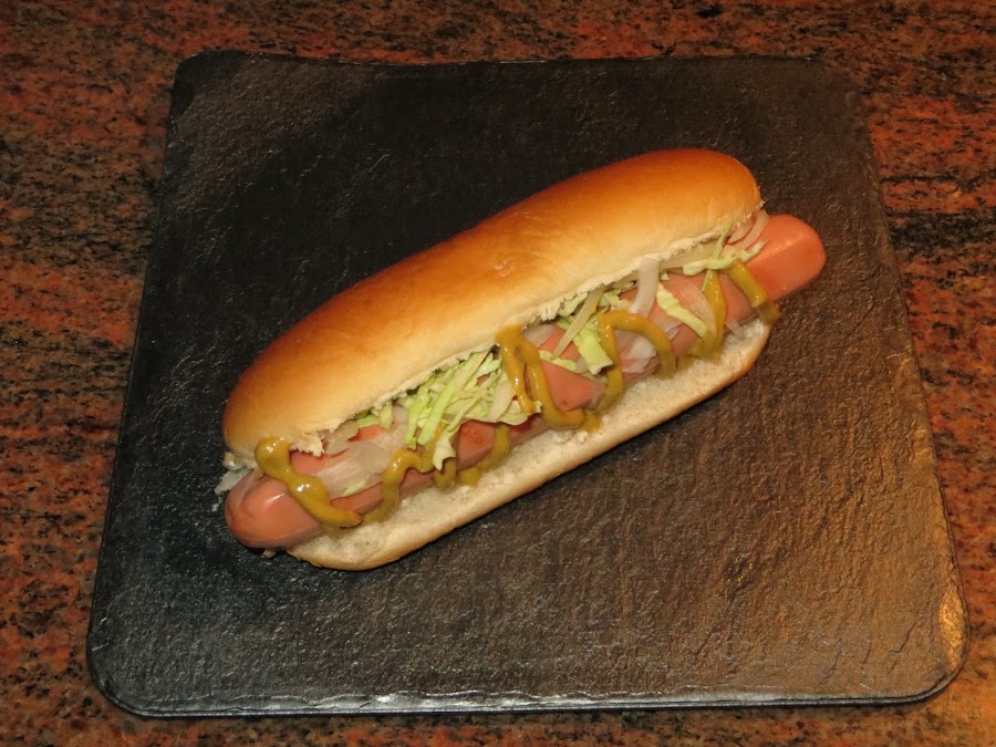 Una vez tenéis listo el pan y la salchicha, metéis en el pan la cebolla, la col y la salchicha y le echáis un chorro generoso de mostaza por encima y ya está listo para comer.