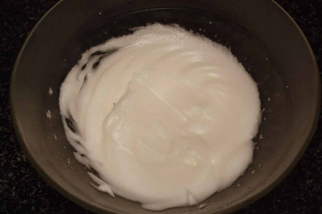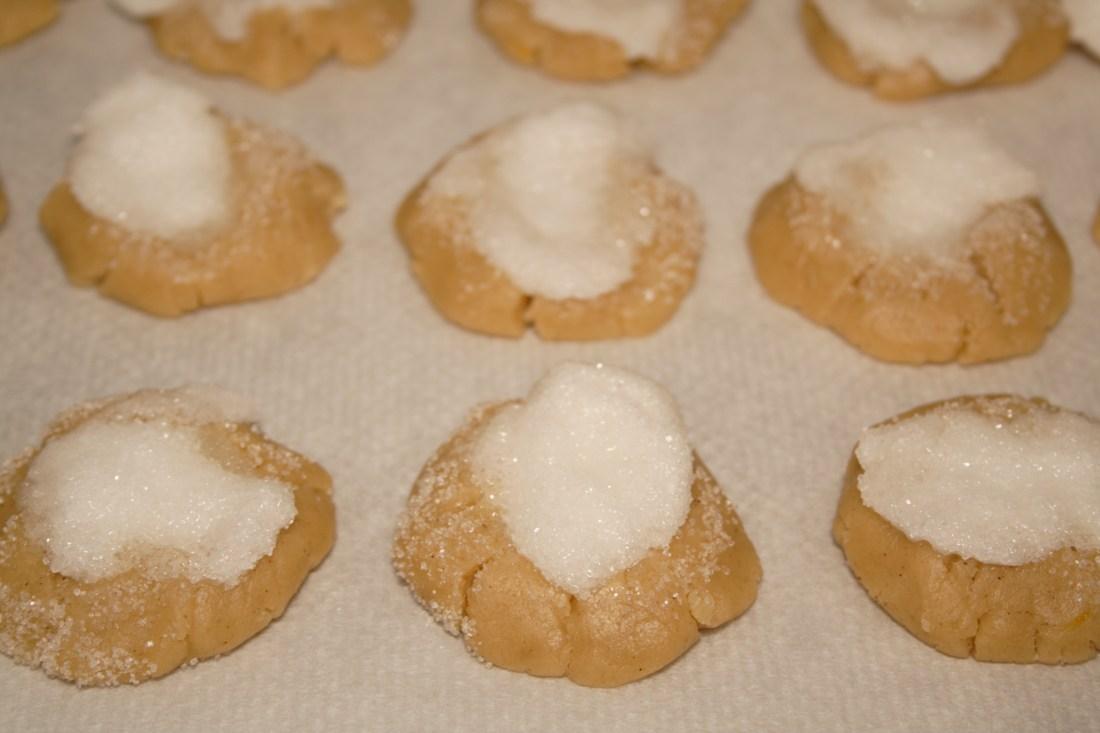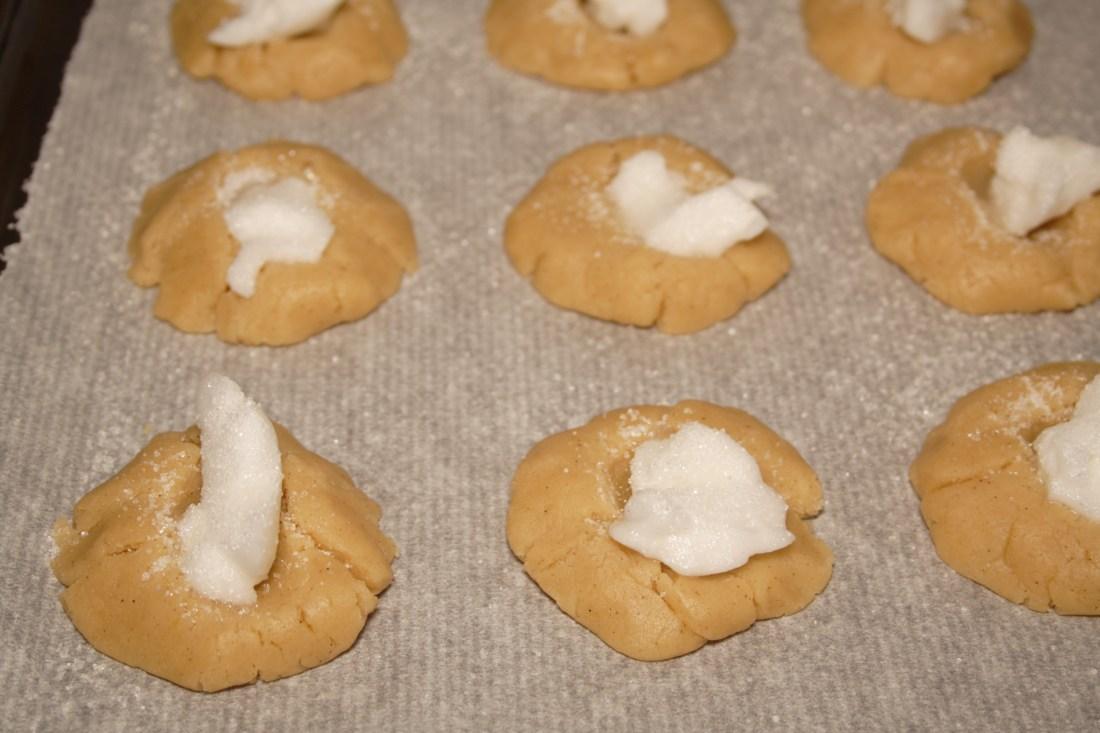 Y con una cucharilla vamos dejando “moñetes” de clara montada sobre las huellas que hicimos en las galletas, pasamos las galletas (con cuidado para que no se rompan) por azúcar blanquilla por la parte del “moñete”, aplastándola un poco para que se impregne con el azúcar.