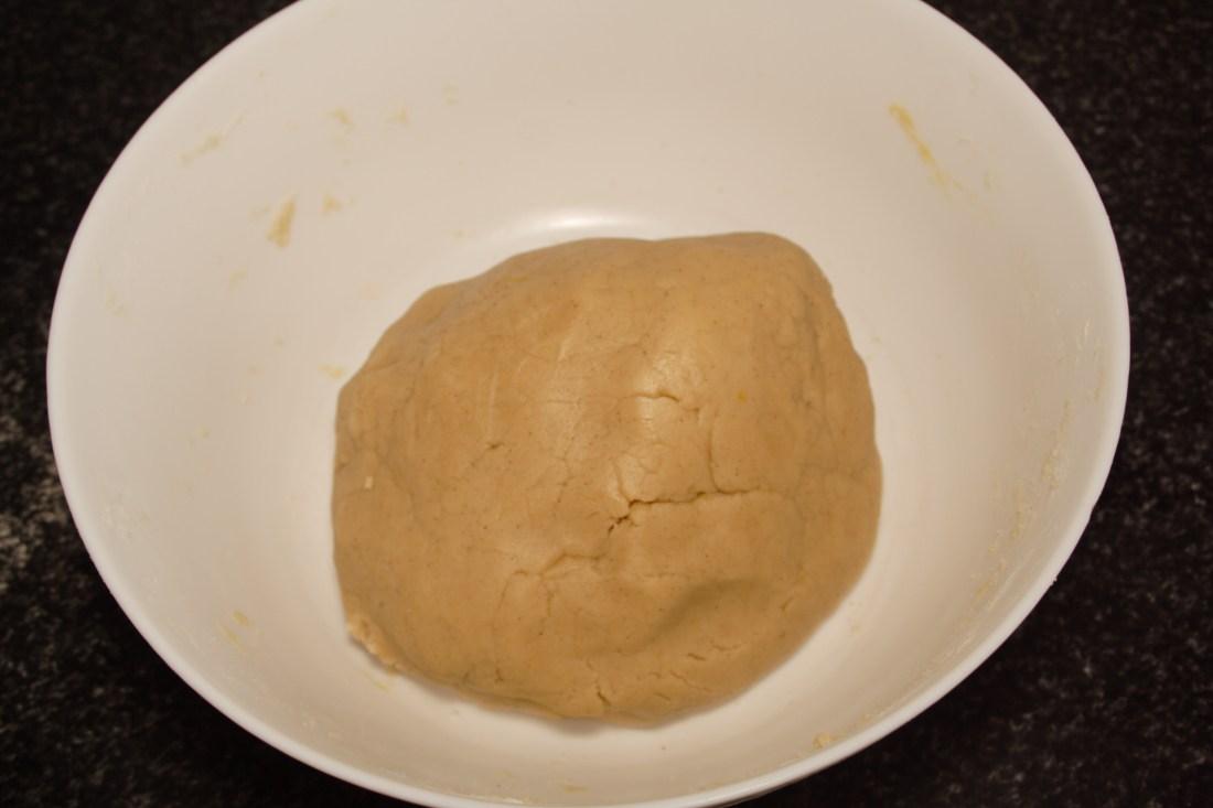 Añadimos 1 huevo entero y la yema del otro, reservando la clara. Batimos enérgicamente. Echamos la canela, la ralladura de limón y la harina, seguimos mezclando con fuerza hasta que nos quede una masa compacta y moldeable, que trabajamos con las manos, si vemos que queda demasiado seca y no se compacta, añadimos un chorro de leche, seguimos amasando hasta que resulte una masa unificada.