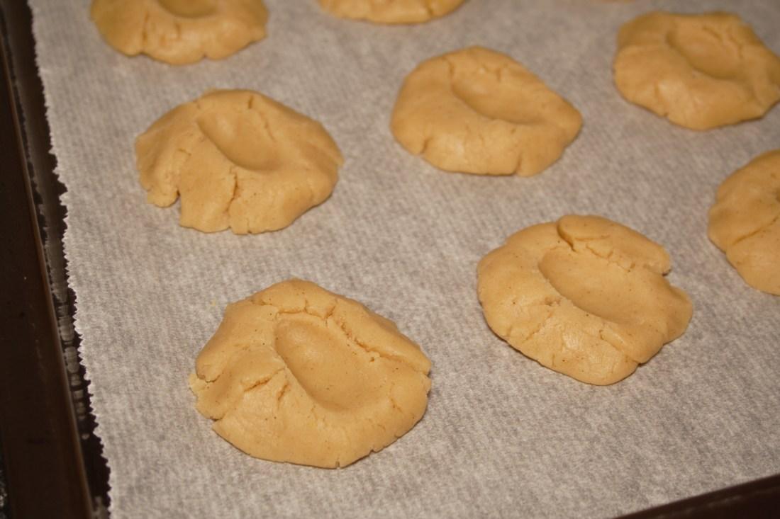 Vamos formando pequeñas porciones redondas de masa, las colocamos en la fuente de horno y aplastamos un poco con la mano, presionando en el centro con el dedo índice para que quede una huella.