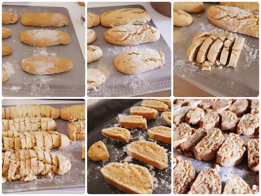 Como no tenia corta-pastas convencionales, ni me apetecía moldear una a una hice pequeños cilindros de masa, como si fueran panecillos alargados, los disponemos sobre una bandeja de horno y metemos en el horno s 170º unos 15 min aproximadamente (el horno lo precalentamos unos 10 min a 250 grados). Cuando veamos que los panecillos se han hinchado y estén un poco tostados los sacamos para cortarlos y hacer como rebanadas de pan (al cortarlos veremos como la capa exterior esta más o menos hecha mientras que el interior aún no) Distribuimos de nuevo las rebanadas sobre una bandeja de horno nuevamente espolvoreada con harina. Y los barnizamos con las claras de huevo y espolvoreamos con canela y azúcar moreno. Metemos en el horno unos 15/20 min hasta que veamos que quedan doradas y ya podemos sacar.