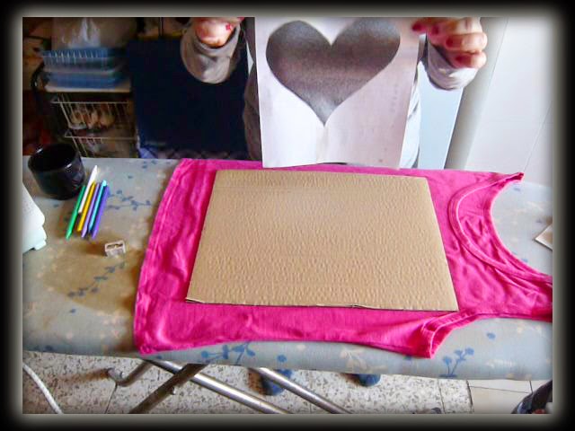 Colocamos un cartón grueso o una tabla de madera dentro de la camiseta para que el dibujo no se pase a la parte de atrás. Para fijar la camiseta podéis cogerla con pinzas de la ropa.