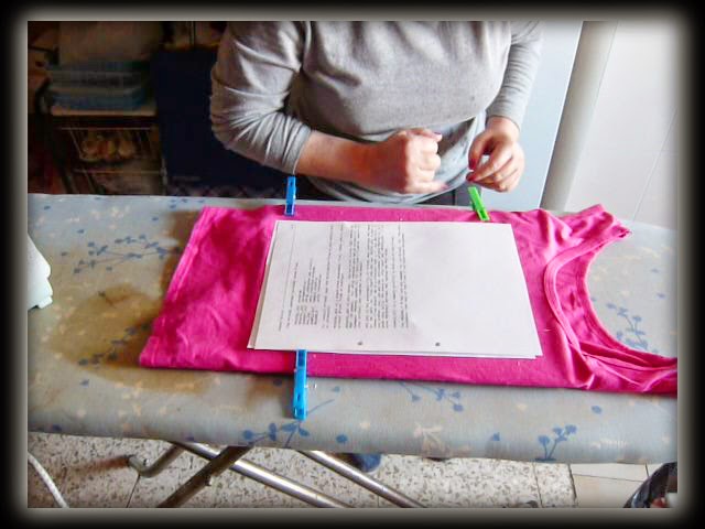 Cuando ya tengamos todo cubierto pasamos a la plancha. Cuidado de quitarle la posición del vapor. Colocamos un folio o papel vegetal sobre la camiseta para que no se nos pegue la plancha y empezamos a darle calor. Al principio aplicamos la plancha a toques, cuando el dibujo empiece a verse por el folio, podemos planchar normalmente.