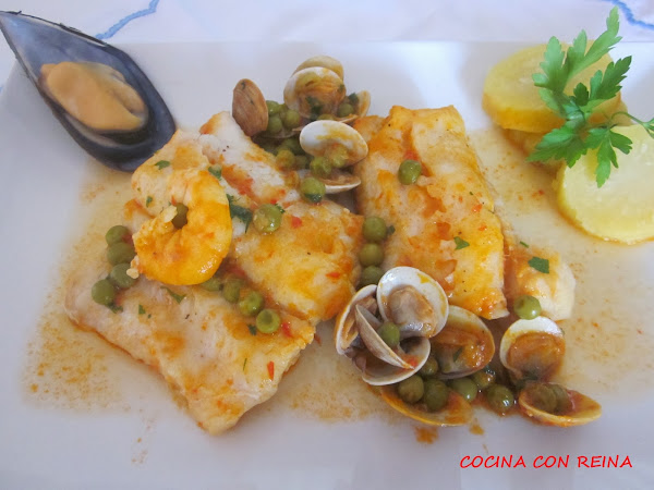 Añadimos la pescada salpimentada, las almejas ,las gambas y los guisantes, hacemos todo junto unos minutos a fuego fuerte, la pescada y las gambas tiene poca cocción y una vez abiertas las almejas, el guiso está listo.