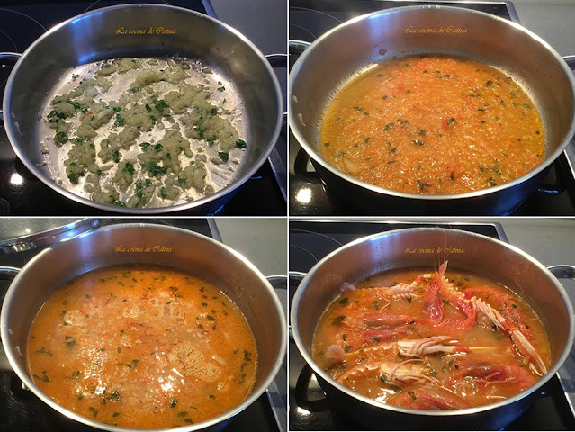 Pelamos el diente de ajo y la cebolla. En una cazuela ponemos aceite a calentar y sofreímos el ajo y la cebolla bien picaditos, hasta que los veamos blanditos. Añadimos el tomate rallado y seguimos friendo durante unos minutos, incorporamos el vino y dejamos cociendo hasta que se evapore el alcohol. Echamos a la cazuela el caldo y cuando esté hirviendo ponemos las gambas, las cigalas, las hebras de azafrán, sal y pimienta al gusto.