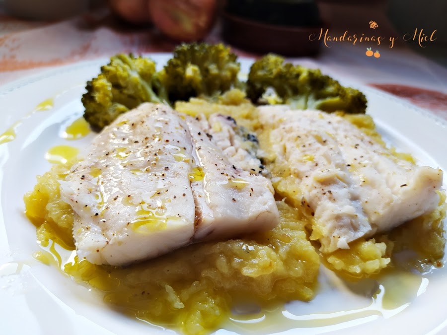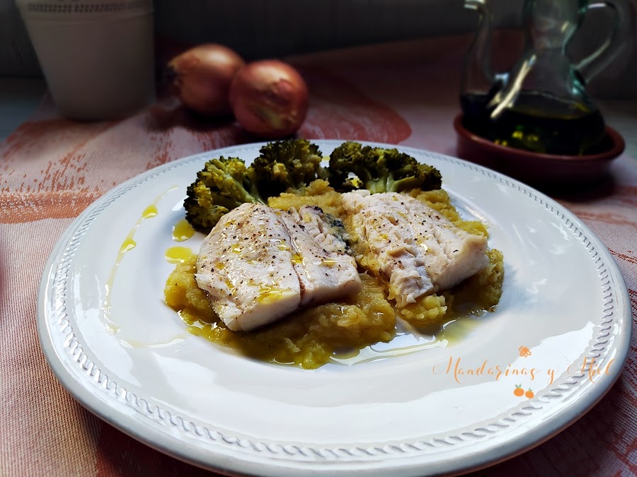 He acompañado la pescadilla con brócoli también cocinado al vapor, y con una cama de puré de cebolla que le aporta un toque riquísimo al pescado y que sorprenderá a los comensales.