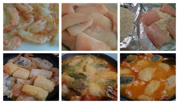Luego preparamos el pescado, si no lo está lo cortamos en filetes y pelamos los gambones, el peso que damos de los gambones es sin pelar. Entonces pasamos el pescado por harina y lo sofreímos en una sartén o cazuela grande, vuelta y vuelta, junto con las gambas.
