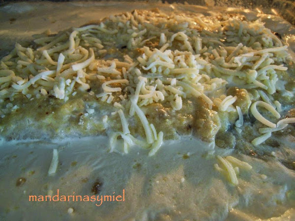 Añade la nata (crema de leche) y mezcla todo, espolvorea el queso rallado y pon al horno precalentado a 200º unos 15 o 20 minutos.