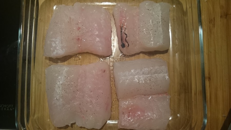 Salpimentamos al gusto las tajadas de pescadilla por ambas caras. Las colocamos en una bandeja de horno untada con un poco de aceite y disponemos los trozos. NOTA: Deben ser de la misma pieza para que así casen bien a la hora de montarlos.