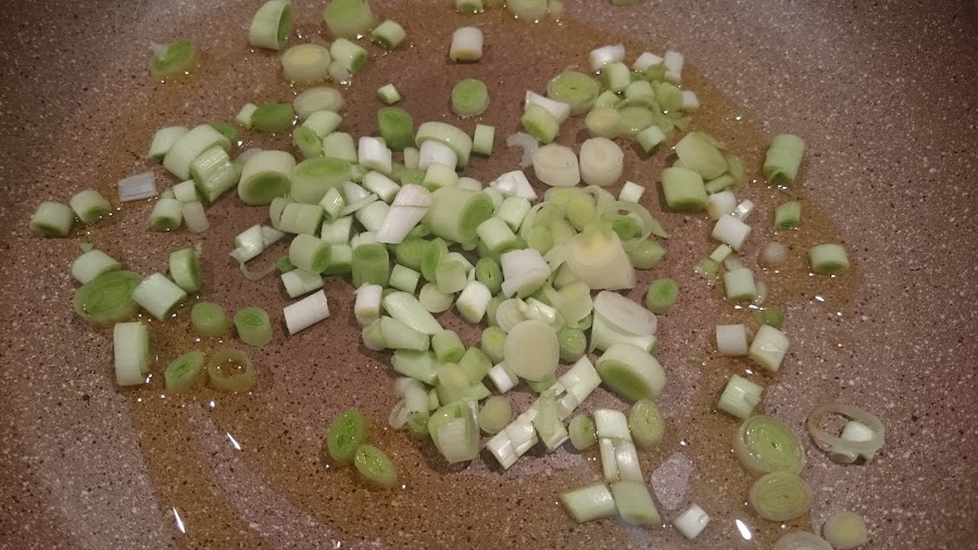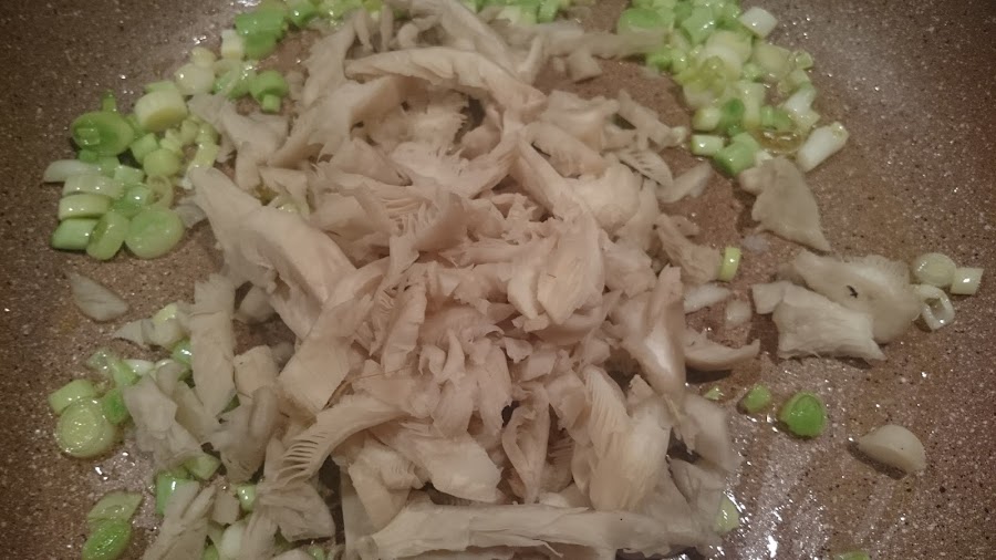 Calentamos en una sartén 2 cucharadas de aceite de oliva y salteamos los ajetes tiernos troceados. Esto nos llevará unos 5 minutos. Incorporamos las setas y sofreímos unos minutos más.