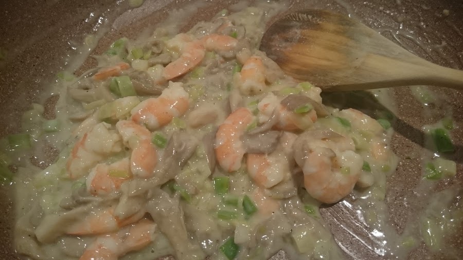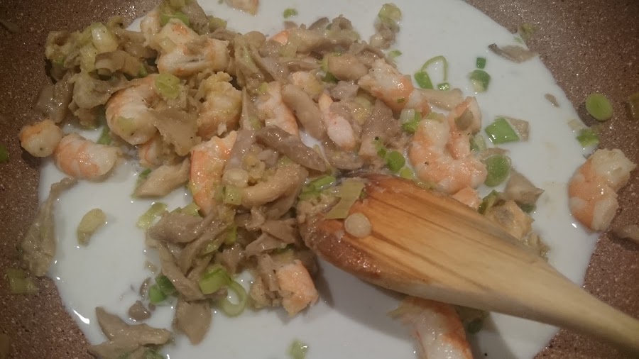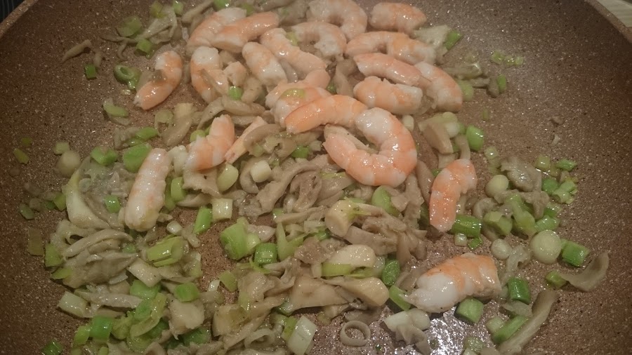 Añadimos los langostinos pelados y troceados y salteamos todo el conjunto 2 minutos más.