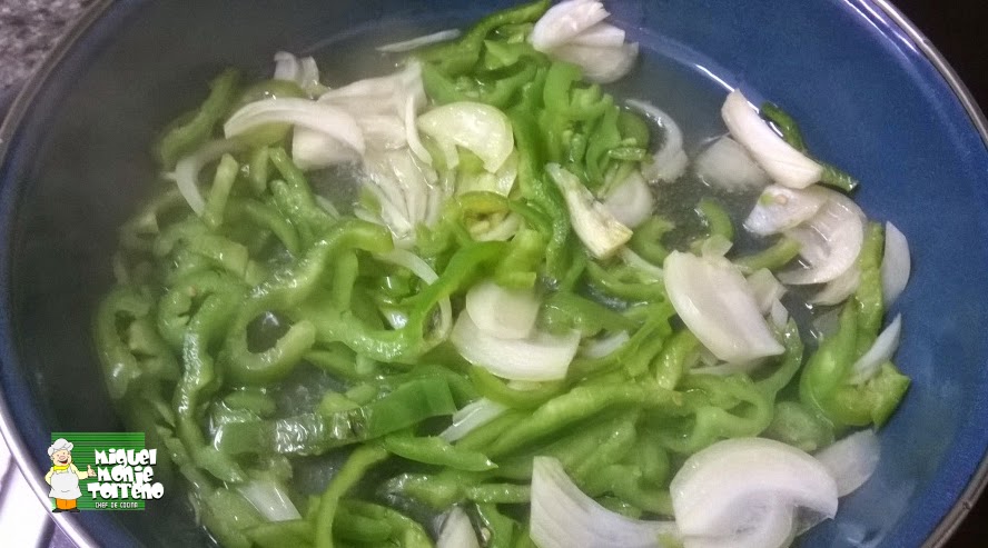 Cortamos los pimientos y la Cebollas en Julianas, y en una cazuela ponemos el aceite a calentar, las ponemos, a pochar, mientras tanto cortaremos el tomate, en rodajas finas.