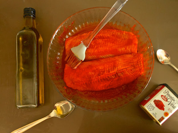 Tras esto, añade sobre cada filete de pescado una cucharada de aceite de oliva y una cucharadita de pimentón dulce, extiende bien esta mezcla embadurnando toda la superficie de los filetes.