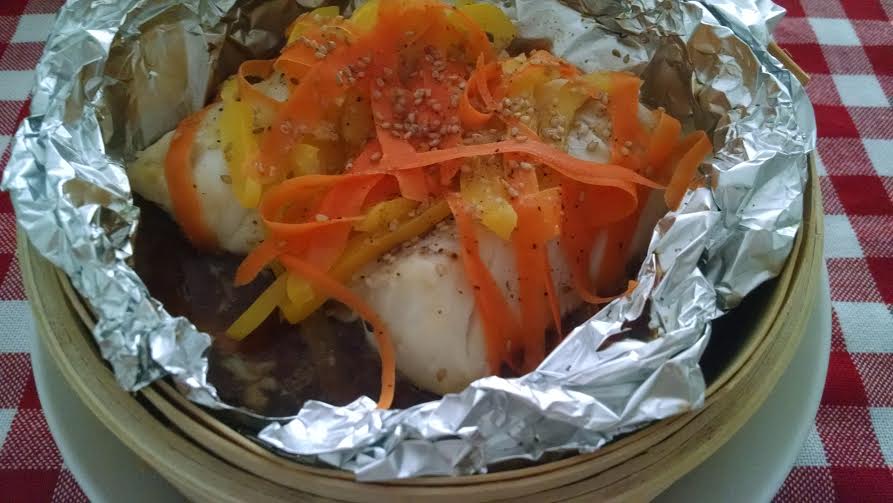 Cuando el agua esté hirviendo y salga el vapor, colocar el pescado en papel de aluminio dentro de la vaporera (igual que en la foto) y tapar. Añadir la mezcla de soja, naranja y jengibre. Por encima colocar la zanahoria, el pimiento y las semillas de sésamo. Dejar cocer unos 10 minutos y listo!