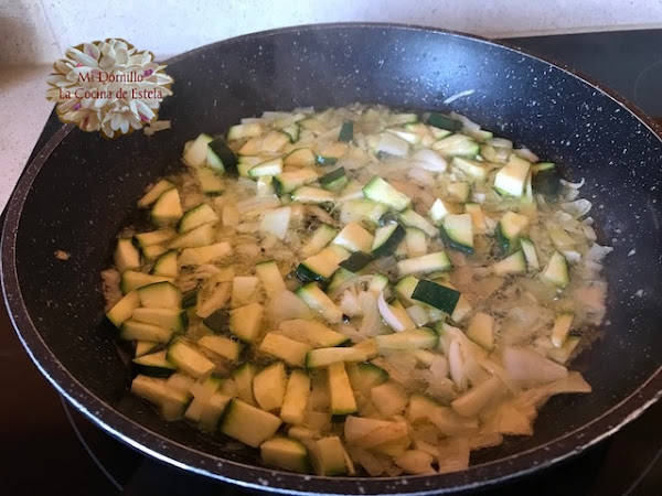 En una cazuela o sarten ponemos la cebolleta y el calabacin picadito, a pochar con un buen chorrito de aceite de oliva.