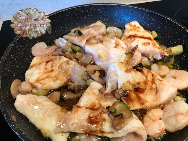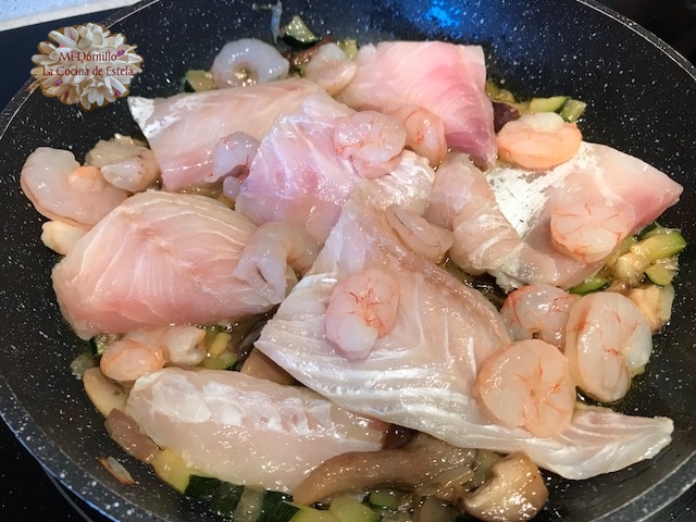 Ponemos los trozos de mero y tapamos con una tapadera para que se vayan haciendo al vapor, unos cinco minutos, añadimos las gambas o langostinos y el chorrito de soja y el jengibre.