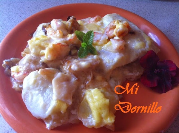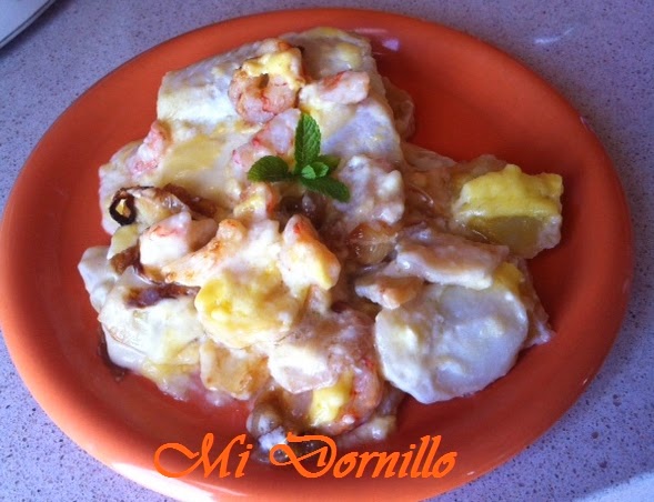 En una fuente refractaria haremos una cama con las patatas y cebolla, poniendo los filetes de pescado u las gambas, y regaremos con el zumo de limos el pescado. Por ultimo echar la salsa mayonesa que hemos preparado por encima de todo, esta salsa tiene que estar mas bien liquida no espesa, pero tampoco muy liquida.En el termino medio.