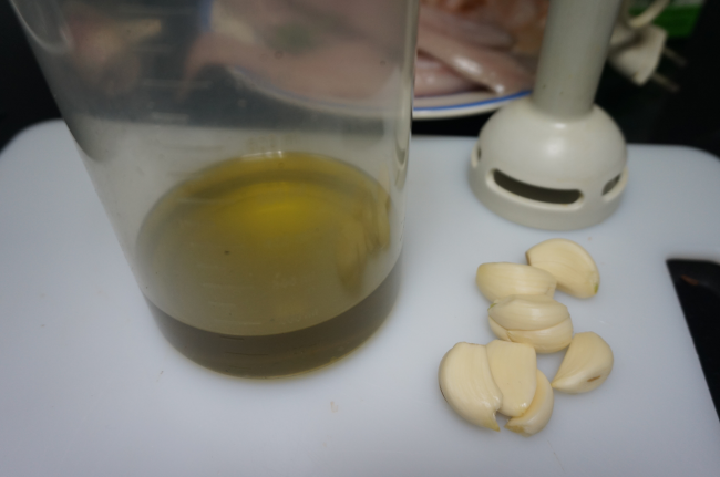 Empezaremos lavando el perejil y pelando los ajos, lo pondremos en un vaso con el aceite y lo trituramos.
