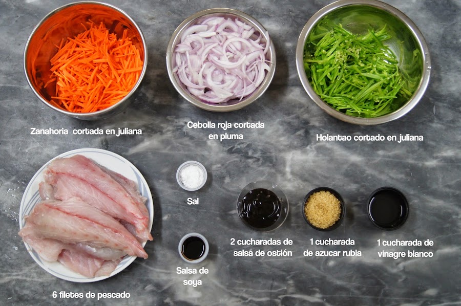 Este es un plato agridulce, una combinación de sabores que va perfecto con el pescado. Es simple muy simple de hacer: se prepara una salsa simple, se saltean las verduras a fuego alto para que queden crocantes y luego se les agrega la salsa agridulce. Este salteado se sirve sobre el pescado frito y se puede acompañar con arroz. Yo utilicé pescado blanco, también se puede utilizar salmón.