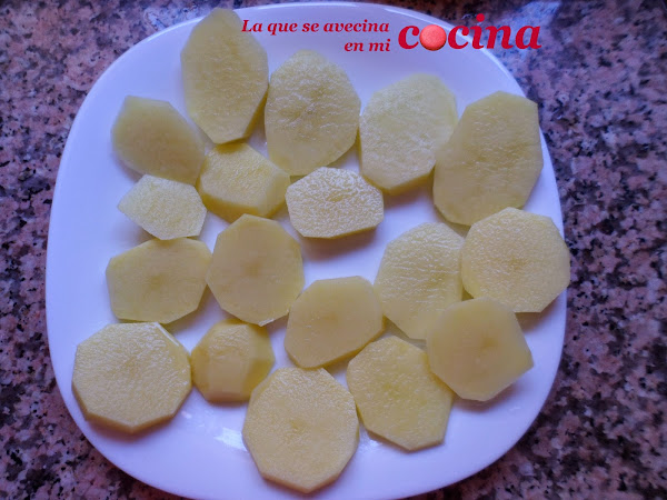Mientras tanto vamos pelando y cortando las patatas. Las cortamos en rodajas y con el grosor de un cm. aproximadamente, ya que si las cortamos demasiado finas se nos romperían al cocinarlas.