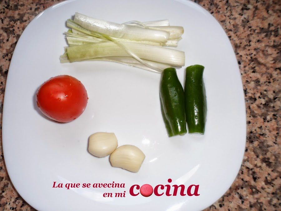 Pelamos la cebolleta y la cortamos por la mitad. Hacemos lo mismo con el pimiento. Pelamos los dientes de ajo y al tomate le hacemos un par de rajas para que suelte el jugo.