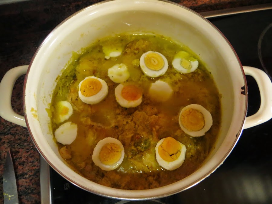 Cuando vemos que se ha consumido un poco el caldo, unos cinco minutos, añadimos el pescado rebozado y salamos la salsa. A continuación, se añade medio vaso más de agua hasta que cubra el pescado por la mitad, hay veces que no hace falta añadirle más agua. Se añaden las gambas y se deja cocer otros diez minutos. El pescado hay que dejarlo cocer poco tiempo, ya que sólo es para que coja el gusto de la salsa. Antes de servirlo se añade el huevo duro y se mece un poco la cacerola y ya está listo para comer.