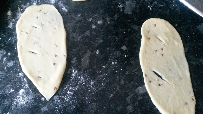 Yo hago bolitas y las estiro con el rodillo como si fueran tortitas haciendole 2 rajitas.
