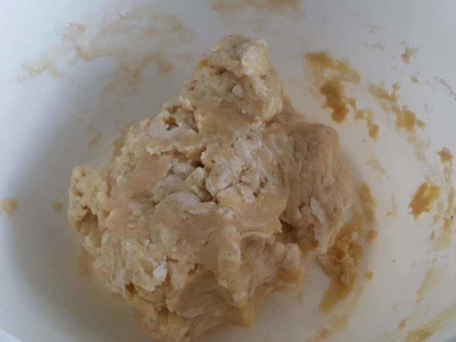 4. - Con una cuchara comenzamos a mezclar, y cuando empiece a despegarse de las paredes, amasamos con las manos.