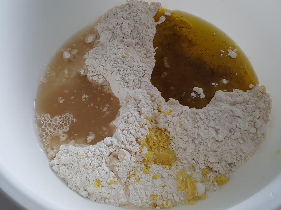 3. - En un bol ponemos la harina, la ralladura de limón, el vino y el aceite ya frío.