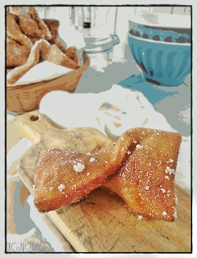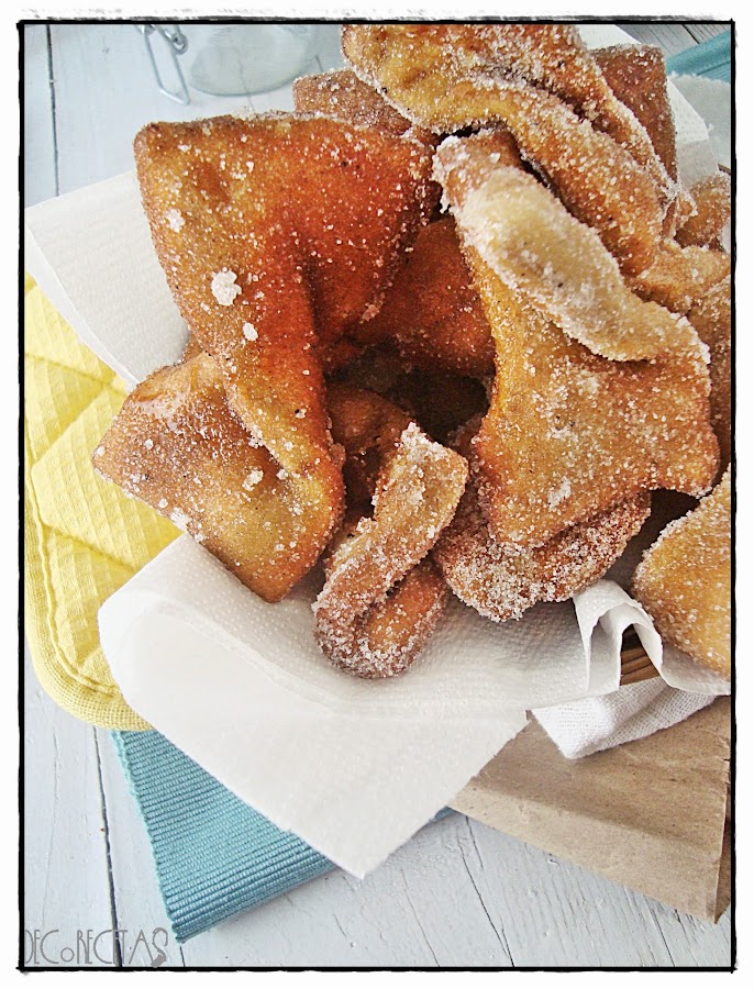 Freímos en abundante aceite caliente, y depositamos posteriormente encima de papel absorvente. Por último, rebozar en la mezcla de azúcar con canela aún calientes.