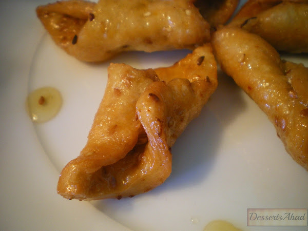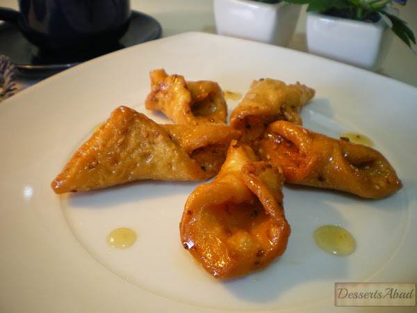 Corta dicha lámina en cuadrados del tamaño deseado (como podeís ver en las fotos, yo los corto de 4x4 cm) y darles forma de pestiños, une dos de las puntas, humedeciéndolas previamente con un poco de agua.