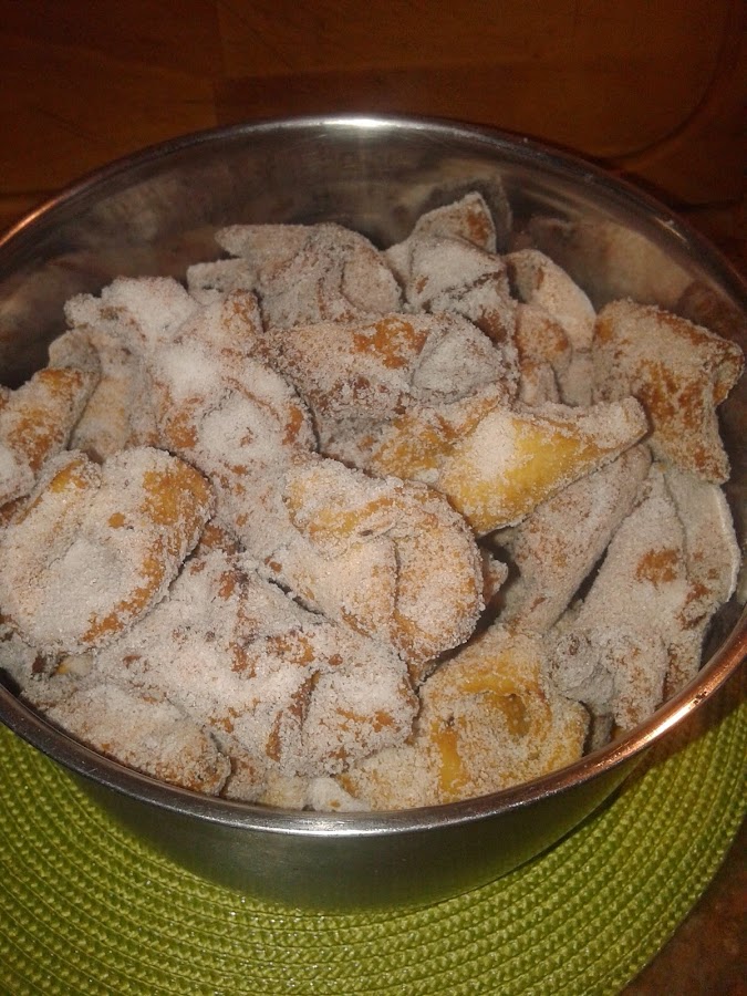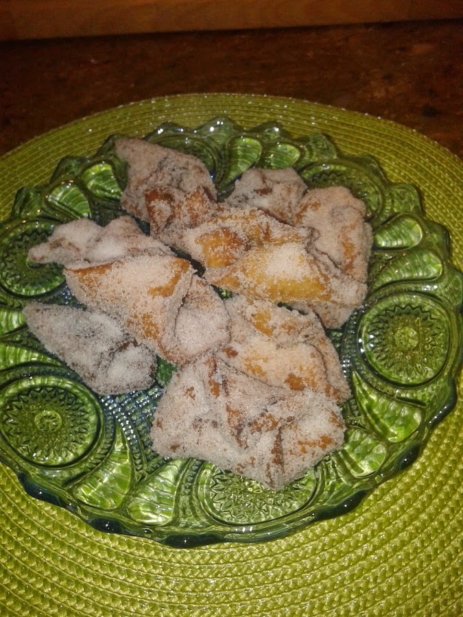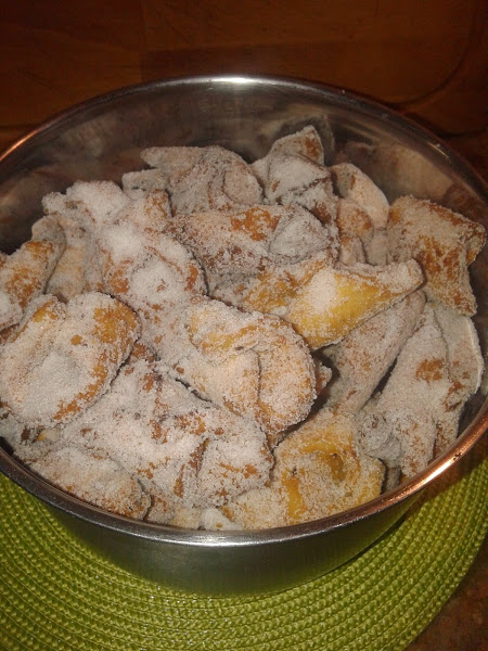 los he rebozado esta vez en azúcar, pero también se rebozan en un almíbar hecho con miel. La próxima vez los haré así. Aunque he hecho una olla bastante grande, tan pronto ha estado hechos han desaparecido. Creo que les han gustado mucho.