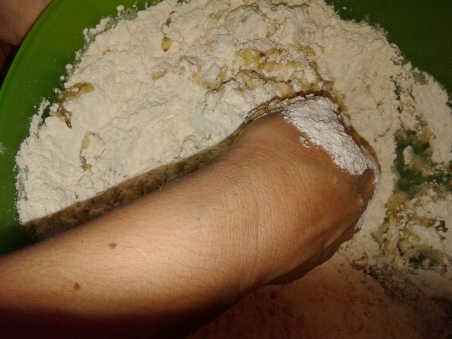 Y por último los ingredientes secos, la harina, un poco de sal y amasamos bien con las manos primero en el cuenco y luego en la tabla o el mármol.