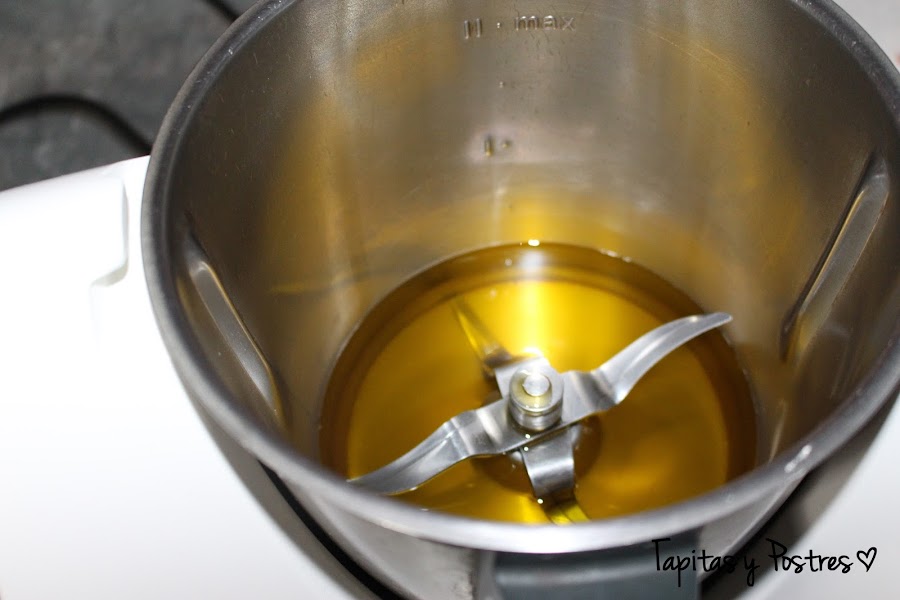 Comenzamos calentando el aceite 3 minutos a temperatura varoma y velocidad 1.